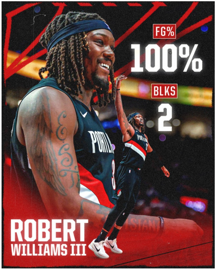 在NBA的赛场上,球员的伤愈复出往往伴随着状态的不确定性——久疏战阵的身体需要重新适应比赛节奏,手感与对抗感觉也需时间找回。然而,波特兰开拓者队的中锋罗伯特·罗威(Robert Williams III)在近期复出后,却用一场近乎完美的表现,给球队与球迷吃下了一颗“定心丸”。开拓者官方微博在赛后第一时间发布消息称:“五投五中+2记盖帽,罗威回归后表现高效。”短短一句话,既概括了他在场上的亮点,也传递出球队对其状态的欣喜与认可。